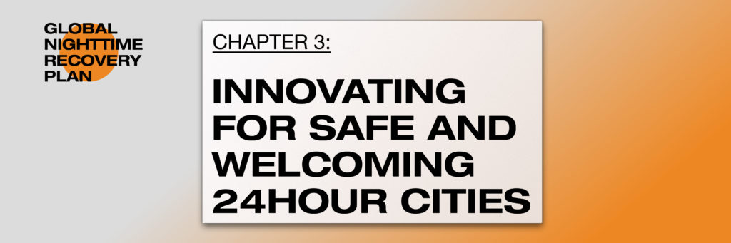 GNRP Chapter 3: Innovating for Safe and Welcoming 24-Hour Cities explores case studies, challenges and possible solutions for welcoming citizens back to their cities at night, presented in three key sections: